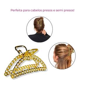 Características principais: - cor dourada; - formato meia lua em correntaria; - kit com 2 unidades iguais; - para todos os tipos de cabelos; - penteados presos e semi-presos; - combina com diversos looks; - material resistente; - não danifica os fios.