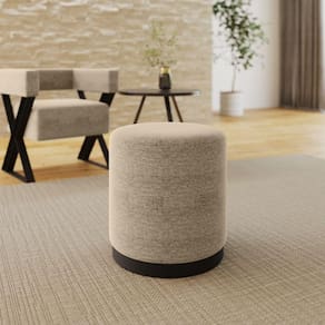 O Puff Redondo Orlandoé revestido em tecido Bouclé ou Linho, com os pés aparentes no estilo industrial trazendo um toque de modernidade, é o móvel perfeito para valorizar a sua decoração.