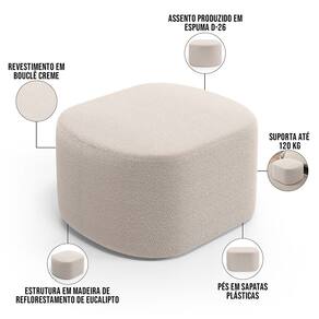 Características: Estrutura em madeira de reflorestamento de eucalipto. Revestimento em Bouclê na cor Creme Assento com espuma D-26. Peso suportado: Até 120 kg. Pés em sapatas plásticas.