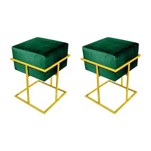 AS IMAGENS SÃO MERAMENTE ILUSTRATIVAS E PODEM SOFRER VARIAÇÕES DE COR E PEQUENOS DETALHES DE ACORDO COM O SEU MONITOR, ILUMINAÇÃO DO AMBIENTE E ATÉ MESMO A SUA PERCEPÇÃO VISUAL.Kit 2 Puffs Decorativos Quadrado Base De Ferro Dourada Tecido Veludo Verde