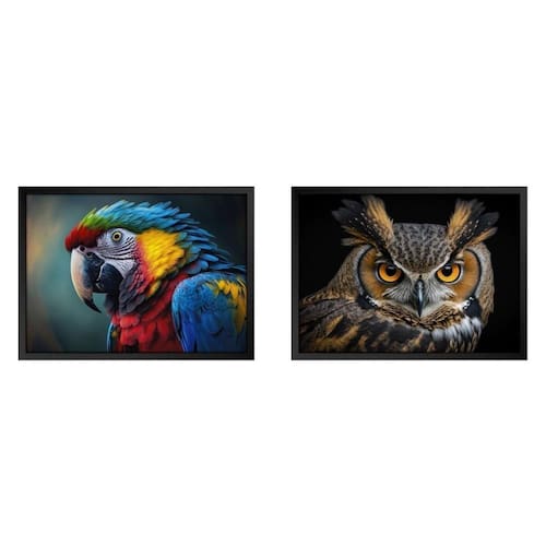 Desperte a beleza da fauna tropical em sua decoração com o Kit 2 Quadros 60cm x 80cm Animal Coruja e Arara Tropical Artes ? uma combinação impressionante que une a elegância enigmática da coruja com a exuberância vibrante da arara, criando um equilíbrio perfeito entre mistério e alegria natural.