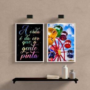 Kit 2 quadros a vida é da cor que a gente pinta- roda gigante 24x18cm - com vidro Moldura: madeira branca Informações do produto tire todas as suas dúvidas no descritivo abaixo: decoração para quarto, sala, cozinha, escritório, área gourmet e muito mais. Chega de paredes vazias medidas - cada peça tem 24x18cm a5 . Material do papel - papel fotográfico brilhante de altíssima resolução acabamento - todos os quadros são acompanhados de vidro para proteção da imagem. - moldura em madeira maciça na cor preta ou branca conforme produto escolhido e pendurador . - os quadros são embalados de forma segura com plástico bolha com camada dupla de acordo com o tamanho dos quadros. Garantia - garantia de 3 meses. Meu quadro chegou. Como posso fixá-lo Você precisa apenas de um martelo e um prego, pois os quadros já vão acompanhados de penduradores. Esta é a forma mais indicada. Como posso limpar meu quadro A limpeza é feita como um móvel comum da sua casa. Apenas um pano seco ou espanador são suficientes para tal Ean: 7893074496854