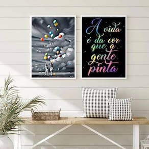 Kit 2 quadros a vida tem a cor que a gente pinta 24x18cm - com vidro Moldura: madeira preta Informações do produto tire todas as suas dúvidas no descritivo abaixo: decoração para quarto, sala, cozinha, escritório, área gourmet e muito mais. Chega de paredes vazias medidas - cada peça tem 24x18cm a5 . Material do papel - papel fotográfico brilhante de altíssima resolução acabamento - todos os quadros são acompanhados de vidro para proteção da imagem. - moldura em madeira maciça na cor preta ou branca conforme produto escolhido e pendurador . - os quadros são embalados de forma segura com plástico bolha com camada dupla de acordo com o tamanho dos quadros. Garantia - garantia de 3 meses. Meu quadro chegou. Como posso fixá-lo Você precisa apenas de um martelo e um prego, pois os quadros já vão acompanhados de penduradores. Esta é a forma mais indicada. Como posso limpar meu quadro A limpeza é feita como um móvel comum da sua casa. Apenas um pano seco ou espanador são suficientes para tal