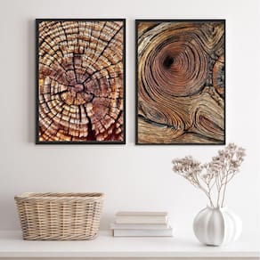 Especificações técnicas: - Kit com 2 quadros abstratos marrons - Fotos de madeiras - Medidas: 24x18cm A5 - Material do papel: papel fotográfico brilhante de altíssima resolução - Acabamento com vidro para proteção da imagem - Moldura em madeira maciça na cor branca - Acompanha pendurador para fixação - Embalagem segura com plástico bolha - Garantia de 3 meses