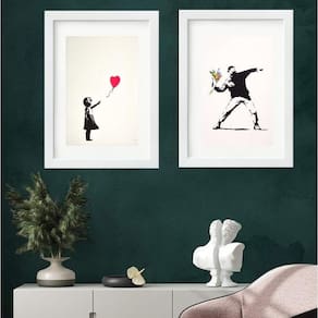 Kit 2 quadros arte banksy - 60x48cm Moldura: madeira preta Informações do produto tire todas as suas dúvidas no descritivo abaixo: decoração para quarto, sala, cozinha, escritório, área gourmet e muito mais. Chega de paredes vazias medidas - cada peça tem 60x48cm . Material do papel - papel fotográfico brilhante de altíssima resolução acabamento - todos os quadros são acompanhados de vidro para proteção da imagem. - moldura em madeira maciça na cor preta ou branca conforme produto escolhido e pendurador. - paspatur branco com 7cm de largura - os quadros são embalados de forma segura com plástico bolha com camada dupla de acordo com o tamanho dos quadros. Garantia - garantia de 3 meses. Meu quadro chegou. Como posso fixá-lo Você precisa apenas de um martelo e um prego, pois os quadros já vão acompanhados de penduradores. Esta é a forma mais indicada. Como posso limpar meu quadro A limpeza é feita como um móvel comum da sua casa. Apenas um pano seco ou espanador são suficientes para tal