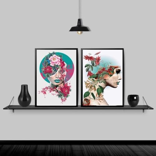 Kit 2 quadros arte mulheres flores 24x18cm Moldura: madeira preta