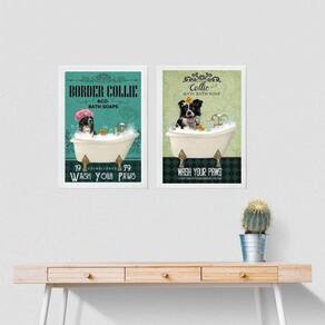 Kit 2 quadros banheiro cão border collie 33x24cm Moldura: madeira branca Informações do produto tire todas as suas dúvidas no descritivo abaixo: decoração para quarto, sala, cozinha, escritório, área gourmet e muito mais. Chega de paredes vazias medidas - cada peça tem 33x24cm a4 . Material do papel - papel fotográfico brilhante de altíssima resolução acabamento - todos os quadros são acompanhados de uma película de acetato para proteção da imagem. - os quadros são embalados de forma segura com plástico bolha com camada dupla de acordo com o tamanho dos quadros. Garantia - garantia de 3 meses. Meu quadro chegou. Como posso fixá-lo Você precisa apenas de um martelo e um prego, pois os quadros já vão acompanhados de penduradores. Esta é a forma mais indicada. Caso prefira, você pode utilizar uma fita dupla face neste caso, sugerimos de alta qualidade para evitar que descole e seu quadro caia . Como posso limpar meu quadro A limpeza é feita como um móvel comum da sua casa. Apenas um pano seco ou espanador são suficientes para tal