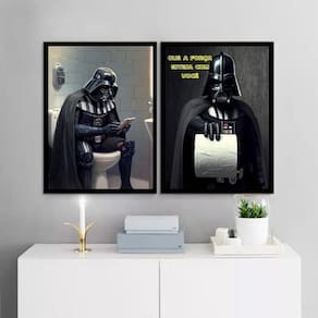 Kit 2 quadros banheiro do darth 24x18cm - com vidro Cor: moldura branca Informações do produto tire todas as suas dúvidas no descritivo abaixo: decoração para quarto, sala, cozinha, escritório, área gourmet e muito mais. Chega de paredes vazias medidas - cada peça tem 24x18cm a5 . Material do papel - papel fotográfico brilhante de altíssima resolução acabamento - todos os quadros são acompanhados de vidro para proteção da imagem. - moldura em madeira maciça na cor preta ou branca conforme produto escolhido e pendurador . - os quadros são embalados de forma segura com plástico bolha com camada dupla de acordo com o tamanho dos quadros. Garantia - garantia de 3 meses. Meu quadro chegou. Como posso fixá-lo Você precisa apenas de um martelo e um prego, pois os quadros já vão acompanhados de penduradores. Esta é a forma mais indicada. Como posso limpar meu quadro A limpeza é feita como um móvel comum da sua casa. Apenas um pano seco ou espanador são suficientes para tal