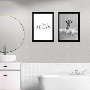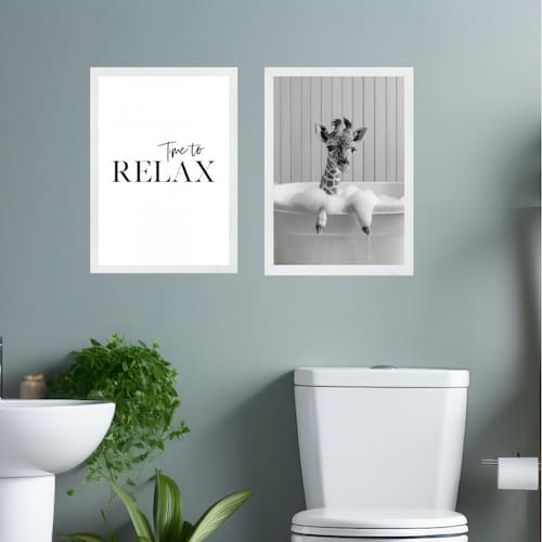 Kit 2 quadros banheiro girafinha - time to relax 33x24cm - com vidro Cor: moldura branca Informações do produto tire todas as suas dúvidas no descritivo abaixo: decoração para quarto, sala, cozinha, escritório, área gourmet e muito mais. Chega de paredes vazias medidas - cada peça tem 33x24cm a4 . Material do papel - papel fotográfico brilhante de altíssima resolução acabamento - todos os quadros são acompanhados de vidro para proteção da imagem. - moldura em madeira maciça na cor preta ou branca conforme produto escolhido e pendurador . - os quadros são embalados de forma segura com plástico bolha com camada dupla de acordo com o tamanho dos quadros. - de 3 meses. Meu quadro chegou. Como posso fixá-lo Você precisa apenas de um martelo e um prego, pois os quadros já vão acompanhados de penduradores. Esta é a forma mais indicada. Como posso limpar meu quadro A limpeza é feita como um móvel comum da sua casa. Apenas um pano seco ou espanador são suficientes para tal