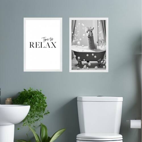 Kit 2 quadros banheiro lhama - time to relax 33x24cm - com vidro Cor: moldura branca Informações do produto tire todas as suas dúvidas no descritivo abaixo: decoração para quarto, sala, cozinha, escritório, área gourmet e muito mais. Chega de paredes vazias medidas - cada peça tem 33x24cm a4 . Material do papel - papel fotográfico brilhante de altíssima resolução acabamento - todos os quadros são acompanhados de vidro para proteção da imagem. - moldura em madeira maciça na cor preta ou branca conforme produto escolhido e pendurador . - os quadros são embalados de forma segura com plástico bolha com camada dupla de acordo com o tamanho dos quadros. - de 3 meses. Meu quadro chegou. Como posso fixá-lo Você precisa apenas de um martelo e um prego, pois os quadros já vão acompanhados de penduradores. Esta é a forma mais indicada. Como posso limpar meu quadro A limpeza é feita como um móvel comum da sua casa. Apenas um pano seco ou espanador são suficientes para tal
