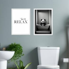 Kit 2 quadros banheiro panda - time to relax 33x24cm - com vidro Cor: moldura branca Informações do produto tire todas as suas dúvidas no descritivo abaixo: decoração para quarto, sala, cozinha, escritório, área gourmet e muito mais. Chega de paredes vazias medidas - cada peça tem 33x24cm a4 . Material do papel - papel fotográfico brilhante de altíssima resolução acabamento - todos os quadros são acompanhados de vidro para proteção da imagem. - moldura em madeira maciça na cor preta ou branca conforme produto escolhido e pendurador . - os quadros são embalados de forma segura com plástico bolha com camada dupla de acordo com o tamanho dos quadros. - de 3 meses. Meu quadro chegou. Como posso fixá-lo Você precisa apenas de um martelo e um prego, pois os quadros já vão acompanhados de penduradores. Esta é a forma mais indicada. Como posso limpar meu quadro A limpeza é feita como um móvel comum da sua casa. Apenas um pano seco ou espanador são suficientes para tal