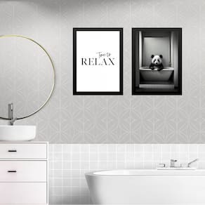 Kit 2 quadros banheiro panda - time to relax 45x34cm Cor: moldura branca Informações do produto tire todas as suas dúvidas no descritivo abaixo: decoração para quarto, sala, cozinha, escritório, área gourmet e muito mais. Chega de paredes vazias. Medidas - cada peça tem 45x34cm a3 . Material do papel - papel fotográfico brilhante de altíssima resolução acabamento - todos os quadros são acompanhados de uma película de acetato para proteção da imagem. - os quadros são embalados de forma segura com plástico bolha com camada dupla de acordo com o tamanho dos quadros. - de 3 meses. Meu quadro chegou. Como posso fixá-lo Você precisa apenas de um martelo e um prego, pois os quadros já vão acompanhados de penduradores. Esta é a forma mais indicada. Caso prefira, você pode utilizar uma fita dupla face neste caso, sugerimos de alta qualidade para evitar que descole e seu quadro caia . Como posso limpar meu quadro A limpeza é feita como um móvel comum da sua casa. Apenas um pano seco ou espanador são suficientes para tal