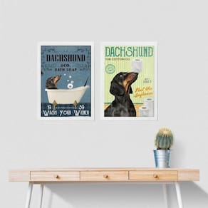 Kit 2 quadros banheiro vintage - dachshund 45x34cm - com vidro Moldura: madeira preta Informações do produto tire todas as suas dúvidas no descritivo abaixo: decoração para quarto, sala, cozinha, escritório, área gourmet e muito mais. Chega de paredes vazias medidas - cada peça tem 45x34cm a3 . Material do papel - papel fotográfico brilhante de altíssima resolução acabamento - todos os quadros são acompanhados de vidro para proteção da imagem. - moldura em madeira maciça na cor preta ou branca conforme produto escolhido e pendurador . - os quadros são embalados de forma segura com plástico bolha com camada dupla de acordo com o tamanho dos quadros. Garantia - garantia de 3 meses. Meu quadro chegou. Como posso fixá-lo Você precisa apenas de um martelo e um prego, pois os quadros já vão acompanhados de penduradores. Esta é a forma mais indicada. Como posso limpar meu quadro A limpeza é feita como um móvel comum da sua casa. Apenas um pano seco ou espanador são suficientes para tal