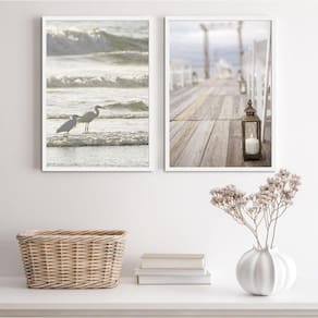 Kit 2 Quadros Brancos Praia- Pássaros Mar Lanterna 45X34Cm