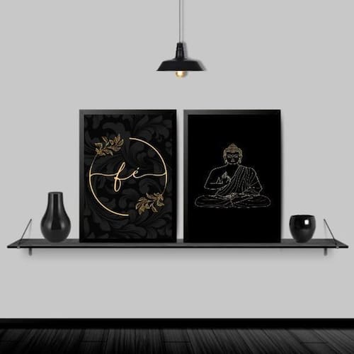 Kit 2 quadros buda fé preto com dourado 45x34cm Moldura: madeira preta Informações do produto tire todas as suas dúvidas no descritivo abaixo: decoração para quarto, sala, cozinha, escritório, área gourmet e muito mais. Chega de paredes vazias. Medidas - cada peça tem 45x34cm a3 . Material do papel - papel fotográfico brilhante de altíssima resolução acabamento - todos os quadros são acompanhados de uma película de acetato para proteção da imagem. - os quadros são embalados de forma segura com plástico bolha com camada dupla de acordo com o tamanho dos quadros. - de 3 meses. Meu quadro chegou. Como posso fixá-lo Você precisa apenas de um martelo e um prego, pois os quadros já vão acompanhados de penduradores. Esta é a forma mais indicada. Caso prefira, você pode utilizar uma fita dupla face neste caso, sugerimos de alta qualidade para evitar que descole e seu quadro caia . Como posso limpar meu quadro A limpeza é feita como um móvel comum da sua casa. Apenas um pano seco ou espanador são suficientes para tal