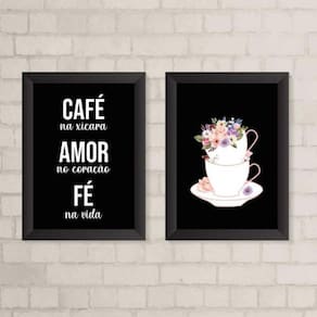 Kit 2 Quadros Café Amor Fé 24x18cm Moldura Preta