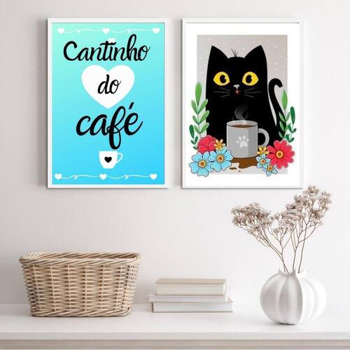 Decore sua casa com estilo e bom gosto com o Kit 2 Quadros Cantinho Do Café Gatinho Floral Azul 45X34Cm! Ean: 7891798278794