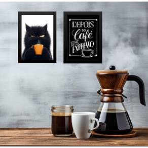 Kit 2 quadros café - gato mal humorado 45x34cm Cor: moldura preta Informações do produto tire todas as suas dúvidas no descritivo abaixo: decoração para quarto, sala, cozinha, escritório, área gourmet e muito mais. Chega de paredes vazias. Medidas - cada peça tem 45x34cm a3 . Material do papel - papel fotográfico brilhante de altíssima resolução acabamento - todos os quadros são acompanhados de uma película de acetato para proteção da imagem. - os quadros são embalados de forma segura com plástico bolha com camada dupla de acordo com o tamanho dos quadros. Garantia - garantia de 3 meses. Meu quadro chegou. Como posso fixá-lo Você precisa apenas de um martelo e um prego, pois os quadros já vão acompanhados de penduradores. Esta é a forma mais indicada. Caso prefira, você pode utilizar uma fita dupla face neste caso, sugerimos de alta qualidade para evitar que descole e seu quadro caia . Como posso limpar meu quadro A limpeza é feita como um móvel comum da sua casa. Apenas um pano seco ou espanador são suficientes para tal