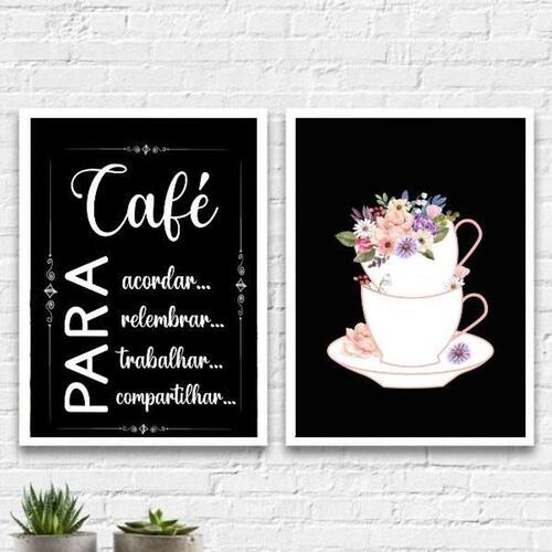 Kit 2 quadros cantinho do café xícaras flores 33x24cm - com vidro Moldura: madeira branca Informações do produto tire todas as suas dúvidas no descritivo abaixo: decoração para quarto, sala, cozinha, escritório, área gourmet e muito mais. Chega de paredes vazias medidas - cada peça tem 33x24cm a4 . Material do papel - papel fotográfico brilhante de altíssima resolução acabamento - todos os quadros são acompanhados de vidro para proteção da imagem. - moldura em madeira maciça na cor preta e pendurador . - os quadros são embalados de forma segura com plástico bolha com camada dupla de acordo com o tamanho dos quadros. Garantia - garantia de 3 meses. Meu quadro chegou. Como posso fixá-lo Você precisa apenas de um martelo e um prego, pois os quadros já vão acompanhados de penduradores. Esta é a forma mais indicada. Como posso limpar meu quadro A limpeza é feita como um móvel comum da sua casa. Apenas um pano seco ou espanador são suficientes para tal