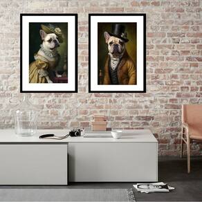Kit 2 Quadros Casal Bulldogs Franceses - 60x48cm - Moldura: Madeira branca