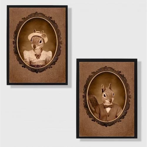Kit 2 quadros casal de esquilos vintage 45x34cm - com vidro Moldura: madeira preta Informações do produto tire todas as suas dúvidas no descritivo abaixo: decoração para quarto, sala, cozinha, escritório, área gourmet e muito mais. Chega de paredes vazias medidas - cada peça tem 45x34cm a3 . Material do papel - papel fotográfico brilhante de altíssima resolução acabamento - todos os quadros são acompanhados de vidro para proteção da imagem. - moldura em madeira maciça na cor preta e pendurador . - os quadros são embalados de forma segura com plástico bolha com camada dupla de acordo com o tamanho dos quadros. Garantia - garantia de 3 meses. Meu quadro chegou. Como posso fixá-lo Você precisa apenas de um martelo e um prego, pois os quadros já vão acompanhados de penduradores. Esta é a forma mais indicada. Como posso limpar meu quadro A limpeza é feita como um móvel comum da sua casa. Apenas um pano seco ou espanador são suficientes para tal