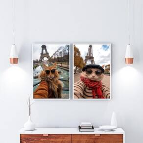 Kit 2 Quadros Casal De Gatos Em Paris 33X24Cm