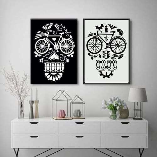 Kit 2 quadros caveiras bicicletas 24x18cm Moldura: madeira preta Informações do produto tire todas as suas dúvidas no descritivo abaixo: decoração para quarto, sala, cozinha, escritório, área gourmet e muito mais. Chega de paredes vazias medidas - cada peça tem 24x18cm a5 . Material do papel - papel fotográfico brilhante de altíssima resolução acabamento - todos os quadros são acompanhados de uma película de acetato para proteção da imagem. - moldura em madeira maciça na cor preta e pendurador móvel que pode ser retirado facilmente caso deseje fixar com fita dupla face. - os quadros são embalados de forma segura com plástico bolha com camada dupla de acordo com o tamanho dos quadros. Garantia - garantia de 3 meses. Meu quadro chegou. Como posso fixá-lo Você precisa apenas de um martelo e um prego, pois os quadros já vão acompanhados de penduradores. Esta é a forma mais indicada. Caso prefira, você pode utilizar uma fita dupla face neste caso, sugerimos de alta qualidade para evitar que descole e seu quadro caia . Como posso limpar meu quadro A limpeza é feita como um móvel comum da sua casa. Apenas um pano seco ou espanador são suficientes para tal