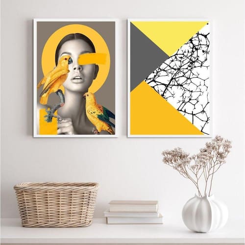 Garanta já o seu Kit 2 Quadros Cinza E Amarelo Mulher Pássaros Abstrato e transforme sua decoração com estilo e bom gosto. Ean: 7894264595494