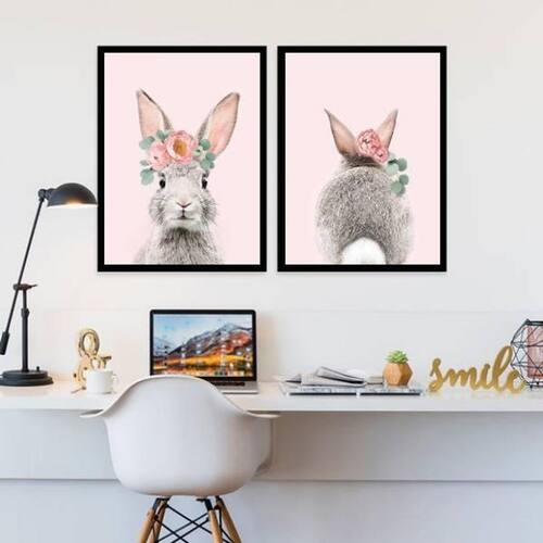 Kit 2 quadros coelhinha floral rosa 45x34cm Moldura: madeira preta Informações do produto tire todas as suas dúvidas no descritivo abaixo: decoração para quarto, sala, cozinha, escritório, área gourmet e muito mais. Chega de paredes vazias medidas - cada peça tem 45x34cm a3 . Material do papel - papel fotográfico brilhante de altíssima resolução acabamento - todos os quadros são acompanhados de uma película de acetato para proteção da imagem. - os quadros são embalados de forma segura com plástico bolha com camada dupla de acordo com o tamanho dos quadros. - de 3 meses. Meu quadro chegou. Como posso fixá-lo Você precisa apenas de um martelo e um prego, pois os quadros já vão acompanhados de penduradores. Esta é a forma mais indicada. Caso prefira, você pode utilizar uma fita dupla face neste caso, sugerimos de alta qualidade para evitar que descole e seu quadro caia . Como posso limpar meu quadro A limpeza é feita como um móvel comum da sua casa. Apenas um pano seco ou espanador são suficientes para tal