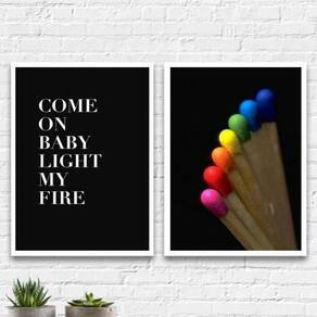 Kit 2 quadros come on baby light my fire 33x24cm - com vidro Moldura: madeira branca Informações do produto tire todas as suas dúvidas no descritivo abaixo: decoração para quarto, sala, cozinha, escritório, área gourmet e muito mais. Chega de paredes vazias medidas - cada peça tem 33x24cm a4 . Material do papel - papel fotográfico brilhante de altíssima resolução acabamento - todos os quadros são acompanhados de vidro para proteção da imagem. - moldura em madeira maciça na cor preta e pendurador . - os quadros são embalados de forma segura com plástico bolha com camada dupla de acordo com o tamanho dos quadros. - de 3 meses. Meu quadro chegou. Como posso fixá-lo Você precisa apenas de um martelo e um prego, pois os quadros já vão acompanhados de penduradores. Esta é a forma mais indicada. Como posso limpar meu quadro A limpeza é feita como um móvel comum da sua casa. Apenas um pano seco ou espanador são suficientes para tal Marca: Não Informado