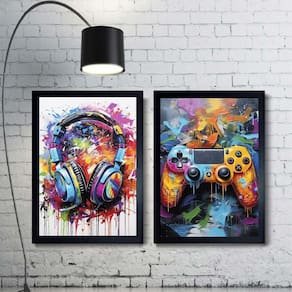 Kit 2 quadros controle vídeo-game e fone de ouvido 33x24cm - com vidro Cor: moldura preta Informações do produto tire todas as suas dúvidas no descritivo abaixo: decoração para quarto, sala, cozinha, escritório, área gourmet e muito mais. Chega de paredes vazias medidas - cada peça tem 33x24cm a4 . Material do papel - papel fotográfico brilhante de altíssima resolução acabamento - todos os quadros são acompanhados de vidro para proteção da imagem. - moldura em madeira maciça na cor preta ou branca conforme produto escolhido e pendurador . - os quadros são embalados de forma segura com plástico bolha com camada dupla de acordo com o tamanho dos quadros. - de 3 meses. Meu quadro chegou. Como posso fixá-lo Você precisa apenas de um martelo e um prego, pois os quadros já vão acompanhados de penduradores. Esta é a forma mais indicada. Como posso limpar meu quadro A limpeza é feita como um móvel comum da sua casa. Apenas um pano seco ou espanador são suficientes para tal