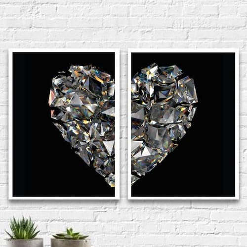 Kit 2 Quadros Coração De Diamantes 33X24Cm Madeira Branca