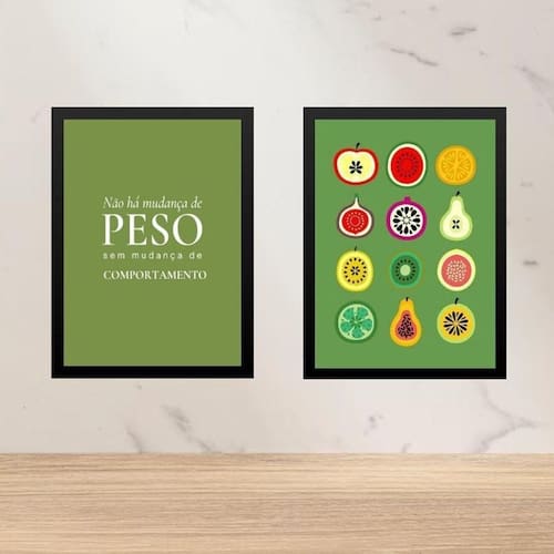 Kit 2 quadros para cozinha - alimentação saudável 24x18cm - com vidro Cor: moldura branca Informações do produto tire todas as suas dúvidas no descritivo abaixo: decoração para quarto, sala, cozinha, escritório, área gourmet e muito mais. Chega de paredes vazias medidas - cada peça tem 24x18cm a5 . Material do papel - papel fotográfico brilhante de altíssima resolução acabamento - todos os quadros são acompanhados de vidro para proteção da imagem. - moldura em madeira maciça na cor preta ou branca conforme produto escolhido e pendurador . - os quadros são embalados de forma segura com plástico bolha com camada dupla de acordo com o tamanho dos quadros. Garantia - garantia de 3 meses. Meu quadro chegou. Como posso fixá-lo Você precisa apenas de um martelo e um prego, pois os quadros já vão acompanhados de penduradores. Esta é a forma mais indicada. Como posso limpar meu quadro A limpeza é feita como um móvel comum da sua casa. Apenas um pano seco ou espanador são suficientes para tal