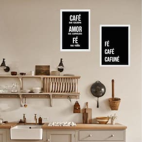 Kit 2 quadros cozinha café e fé 24x18cm - com vidro Moldura: madeira branca Informações do produto tire todas as suas dúvidas no descritivo abaixo: decoração para quarto, sala, cozinha, escritório, área gourmet e muito mais. Chega de paredes vazias medidas - cada peça tem 24x18cm a5 . Material do papel - papel fotográfico brilhante de altíssima resolução acabamento - todos os quadros são acompanhados de vidro para proteção da imagem. - moldura em madeira maciça na cor preta ou branca conforme produto escolhido e pendurador . - os quadros são embalados de forma segura com plástico bolha com camada dupla de acordo com o tamanho dos quadros. Garantia - garantia de 3 meses. Meu quadro chegou. Como posso fixá-lo Você precisa apenas de um martelo e um prego, pois os quadros já vão acompanhados de penduradores. Esta é a forma mais indicada. Como posso limpar meu quadro A limpeza é feita como um móvel comum da sua casa. Apenas um pano seco ou espanador são suficientes para tal