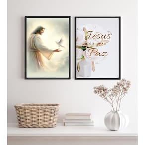 Kit 2 quadros cristãos jesus é a nossa paz 33x24cm Moldura: madeira branca Informações do produto tire todas as suas dúvidas no descritivo abaixo: decoração para quarto, sala, cozinha, escritório, área gourmet e muito mais. Chega de paredes vazias medidas - cada peça tem 33x24cm a4 . Material do papel - papel fotográfico brilhante de altíssima resolução acabamento - todos os quadros são acompanhados de uma película de acetato para proteção da imagem. - os quadros são embalados de forma segura com plástico bolha com camada dupla de acordo com o tamanho dos quadros. Garantia - garantia de 3 meses. Meu quadro chegou. Como posso fixá-lo Você precisa apenas de um martelo e um prego, pois os quadros já vão acompanhados de penduradores. Esta é a forma mais indicada. Caso prefira, você pode utilizar uma fita dupla face neste caso, sugerimos de alta qualidade para evitar que descole e seu quadro caia . Como posso limpar meu quadro A limpeza é feita como um móvel comum da sua casa. Apenas um pano seco ou espanador são suficientes para tal Ean: 7896103045191