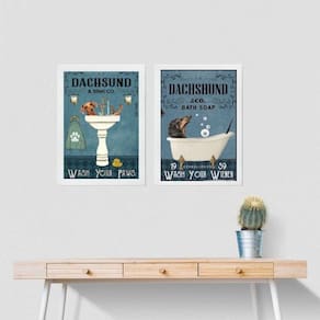 Kit 2 quadros de banheiro cão dachshund 45x34cm Moldura: madeira preta Informações do produto tire todas as suas dúvidas no descritivo abaixo: decoração para quarto, sala, cozinha, escritório, área gourmet e muito mais. Chega de paredes vazias. Medidas - cada peça tem 45x34cm a3 . Material do papel - papel fotográfico brilhante de altíssima resolução acabamento - todos os quadros são acompanhados de uma película de acetato para proteção da imagem. - os quadros são embalados de forma segura com plástico bolha com camada dupla de acordo com o tamanho dos quadros. Garantia - garantia de 3 meses. Meu quadro chegou. Como posso fixá-lo Você precisa apenas de um martelo e um prego, pois os quadros já vão acompanhados de penduradores. Esta é a forma mais indicada. Caso prefira, você pode utilizar uma fita dupla face neste caso, sugerimos de alta qualidade para evitar que descole e seu quadro caia . Como posso limpar meu quadro A limpeza é feita como um móvel comum da sua casa. Apenas um pano seco ou espanador são suficientes para tal