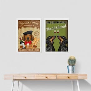 Kit 2 quadros de cozinha cão dachshund 24x18cm - com vidro Moldura: madeira preta Informações do produto tire todas as suas dúvidas no descritivo abaixo: decoração para quarto, sala, cozinha, escritório, área gourmet e muito mais. Chega de paredes vazias medidas - cada peça tem 24x18cm a5 . Material do papel - papel fotográfico brilhante de altíssima resolução acabamento - todos os quadros são acompanhados de vidro para proteção da imagem. - moldura em madeira maciça na cor preta ou branca conforme produto escolhido e pendurador . - os quadros são embalados de forma segura com plástico bolha com camada dupla de acordo com o tamanho dos quadros. Garantia - garantia de 3 meses. Meu quadro chegou. Como posso fixá-lo Você precisa apenas de um martelo e um prego, pois os quadros já vão acompanhados de penduradores. Esta é a forma mais indicada. Como posso limpar meu quadro A limpeza é feita como um móvel comum da sua casa. Apenas um pano seco ou espanador são suficientes para tal