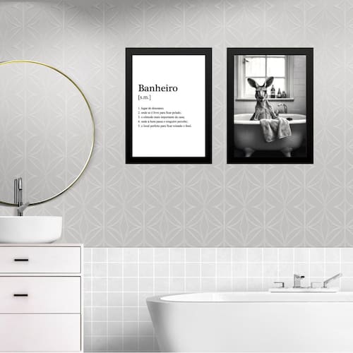 Kit 2 quadros decorar banheiro - canguru 45x34cm - com vidro Cor: moldura preta Informações do produto tire todas as suas dúvidas no descritivo abaixo: decoração para quarto, sala, cozinha, escritório, área gourmet e muito mais. Chega de paredes vazias medidas - cada peça tem 45x34cm a3 . Material do papel - papel fotográfico brilhante de altíssima resolução acabamento - todos os quadros são acompanhados de vidro para proteção da imagem. - moldura em madeira maciça na cor preta ou branca conforme produto escolhido e pendurador . - os quadros são embalados de forma segura com plástico bolha com camada dupla de acordo com o tamanho dos quadros. Garantia - garantia de 3 meses. Meu quadro chegou. Como posso fixá-lo Você precisa apenas de um martelo e um prego, pois os quadros já vão acompanhados de penduradores. Esta é a forma mais indicada. Como posso limpar meu quadro A limpeza é feita como um móvel comum da sua casa. Apenas um pano seco ou espanador são suficientes para tal