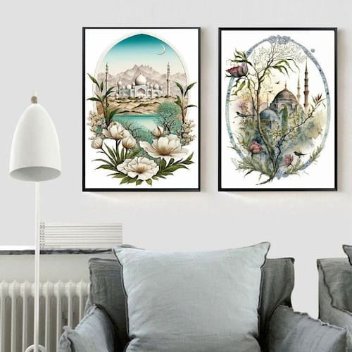 Kit 2 quadros decorativos aquarelas muçulmanas 45x34cm - com vidro Moldura: madeira branca Informações do produto tire todas as suas dúvidas no descritivo abaixo: decoração para quarto, sala, cozinha, escritório, área gourmet e muito mais. Chega de paredes vazias medidas - cada peça tem 45x34cm a3 . Material do papel - papel fotográfico brilhante de altíssima resolução acabamento - todos os quadros são acompanhados de vidro para proteção da imagem. - moldura em madeira maciça na cor preta ou branca conforme produto escolhido e pendurador . - os quadros são embalados de forma segura com plástico bolha com camada dupla de acordo com o tamanho dos quadros. Garantia - garantia de 3 meses. Meu quadro chegou. Como posso fixá-lo Você precisa apenas de um martelo e um prego, pois os quadros já vão acompanhados de penduradores. Esta é a forma mais indicada. Como posso limpar meu quadro A limpeza é feita como um móvel comum da sua casa. Apenas um pano seco ou espanador são suficientes para tal