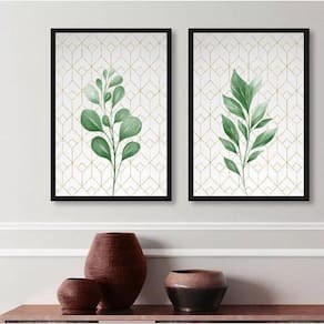 Kit 2 quadros decorativos folhas verdes fundo geométrico 33x24cm - com vidro Moldura: madeira branca Informações do produto tire todas as suas dúvidas no descritivo abaixo: decoração para quarto, sala, cozinha, escritório, área gourmet e muito mais. Chega de paredes vazias medidas - cada peça tem 33x24cm a4 . Material do papel - papel fotográfico brilhante de altíssima resolução acabamento - todos os quadros são acompanhados de vidro para proteção da imagem. - moldura em madeira maciça na cor preta ou branca conforme produto escolhido e pendurador . - os quadros são embalados de forma segura com plástico bolha com camada dupla de acordo com o tamanho dos quadros. Garantia - garantia de 3 meses. Meu quadro chegou. Como posso fixá-lo Você precisa apenas de um martelo e um prego, pois os quadros já vão acompanhados de penduradores. Esta é a forma mais indicada. Como posso limpar meu quadro A limpeza é feita como um móvel comum da sua casa. Apenas um pano seco ou espanador são suficientes para tal Ean: 7894372139504