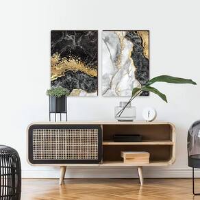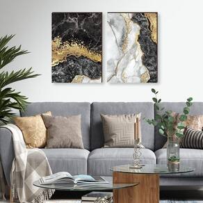 Kit 2 Quadros Decorativos Mármore Abstrato Cinza com Dourado 50x70cm
