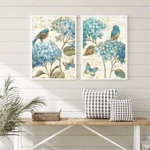 Kit 2 quadros decorativos passarinhos hortências 24x18cm