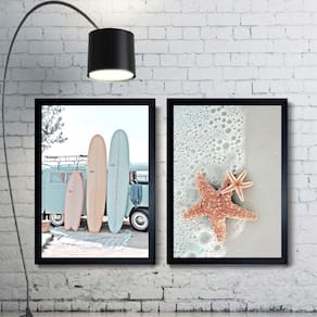 Kit 2 quadros decorativos de praia - surf estrela do mar 24x18cm - com vidro Cor: moldura branca Informações do produto tire todas as suas dúvidas no descritivo abaixo: decoração para quarto, sala, cozinha, escritório, área gourmet e muito mais. Chega de paredes vazias medidas - cada peça tem 24x18cm a5 . Material do papel - papel fotográfico brilhante de altíssima resolução acabamento - todos os quadros são acompanhados de vidro para proteção da imagem. - moldura em madeira maciça na cor preta ou branca conforme produto escolhido e pendurador . - os quadros são embalados de forma segura com plástico bolha com camada dupla de acordo com o tamanho dos quadros. - de 3 meses. Meu quadro chegou. Como posso fixá-lo Você precisa apenas de um martelo e um prego, pois os quadros já vão acompanhados de penduradores. Esta é a forma mais indicada. Como posso limpar meu quadro A limpeza é feita como um móvel comum da sua casa. Apenas um pano seco ou espanador são suficientes para tal