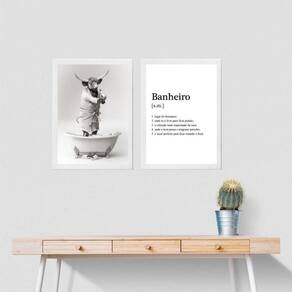 Kit 2 quadros divertidos banheiro - boi 45x34cm Moldura: madeira branca Informações do produto tire todas as suas dúvidas no descritivo abaixo: decoração para quarto, sala, cozinha, escritório, área gourmet e muito mais. Chega de paredes vazias. Medidas - cada peça tem 45x34cm a3 . Material do papel - papel fotográfico brilhante de altíssima resolução acabamento - todos os quadros são acompanhados de uma película de acetato para proteção da imagem. - os quadros são embalados de forma segura com plástico bolha com camada dupla de acordo com o tamanho dos quadros. Garantia - garantia de 3 meses. Meu quadro chegou. Como posso fixá-lo Você precisa apenas de um martelo e um prego, pois os quadros já vão acompanhados de penduradores. Esta é a forma mais indicada. Caso prefira, você pode utilizar uma fita dupla face neste caso, sugerimos de alta qualidade para evitar que descole e seu quadro caia . Como posso limpar meu quadro A limpeza é feita como um móvel comum da sua casa. Apenas um pano seco ou espanador são suficientes para tal