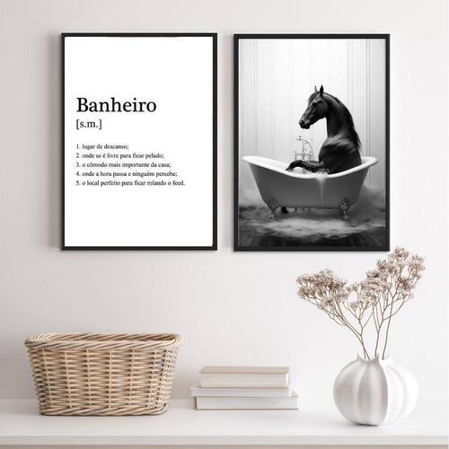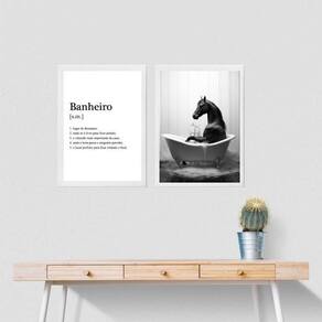 Kit 2 quadros divertidos banheiro - cavalo 33x24cm - com vidro Moldura: madeira branca Informações do produto tire todas as suas dúvidas no descritivo abaixo: decoração para quarto, sala, cozinha, escritório, área gourmet e muito mais. Chega de paredes vazias medidas - cada peça tem 33x24cm a4 . Material do papel - papel fotográfico brilhante de altíssima resolução acabamento - todos os quadros são acompanhados de vidro para proteção da imagem. - moldura em madeira maciça na cor preta ou branca conforme produto escolhido e pendurador . - os quadros são embalados de forma segura com plástico bolha com camada dupla de acordo com o tamanho dos quadros. Garantia - garantia de 3 meses. Meu quadro chegou. Como posso fixá-lo Você precisa apenas de um martelo e um prego, pois os quadros já vão acompanhados de penduradores. Esta é a forma mais indicada. Como posso limpar meu quadro A limpeza é feita como um móvel comum da sua casa. Apenas um pano seco ou espanador são suficientes para tal