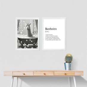 Kit 2 quadros divertidos banheiro - lhama 33x24cm Moldura: madeira branca Informações do produto tire todas as suas dúvidas no descritivo abaixo: decoração para quarto, sala, cozinha, escritório, área gourmet e muito mais. Chega de paredes vazias medidas - cada peça tem 33x24cm a4 . Material do papel - papel fotográfico brilhante de altíssima resolução acabamento - todos os quadros são acompanhados de uma película de acetato para proteção da imagem. - os quadros são embalados de forma segura com plástico bolha com camada dupla de acordo com o tamanho dos quadros. Garantia - garantia de 3 meses. Meu quadro chegou. Como posso fixá-lo Você precisa apenas de um martelo e um prego, pois os quadros já vão acompanhados de penduradores. Esta é a forma mais indicada. Caso prefira, você pode utilizar uma fita dupla face neste caso, sugerimos de alta qualidade para evitar que descole e seu quadro caia . Como posso limpar meu quadro A limpeza é feita como um móvel comum da sua casa. Apenas um pano seco ou espanador são suficientes para tal