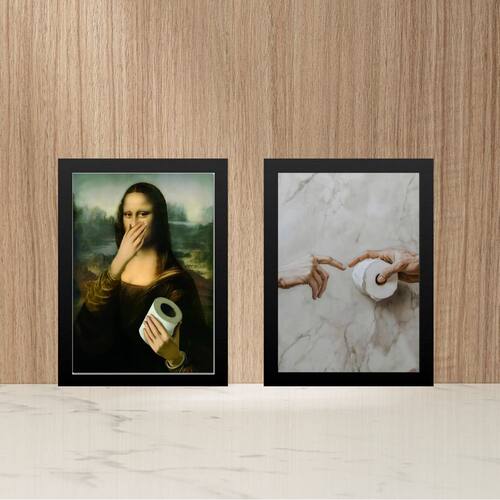 Kit 2 Quadros Divertidos Banheiro - Paródia Pinturas 45x34cm - Cor: Moldura preta