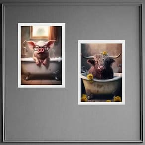 Kit 2 quadros divertidos banheiro - porco e boi 33x24cm - com vidro