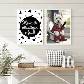 Kit 2 quadros divertidos banheiro terrier 45x34cm - com vidro Cor: moldura branca Informações do produto tire todas as suas dúvidas no descritivo abaixo: decoração para quarto, sala, cozinha, escritório, área gourmet e muito mais. Chega de paredes vazias medidas - cada peça tem 45x34cm a3 . Material do papel - papel fotográfico brilhante de altíssima resolução acabamento - todos os quadros são acompanhados de vidro para proteção da imagem. - moldura em madeira maciça na cor preta ou branca conforme produto escolhido e pendurador . - os quadros são embalados de forma segura com plástico bolha com camada dupla de acordo com o tamanho dos quadros. Garantia - garantia de 3 meses. Meu quadro chegou. Como posso fixá-lo Você precisa apenas de um martelo e um prego, pois os quadros já vão acompanhados de penduradores. Esta é a forma mais indicada. Como posso limpar meu quadro A limpeza é feita como um móvel comum da sua casa. Apenas um pano seco ou espanador são suficientes para tal