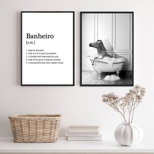 Kit 2 quadros divertidos banheiro - zebra 45x34cm Moldura: madeira preta Informações do produto tire todas as suas dúvidas no descritivo abaixo: decoração para quarto, sala, cozinha, escritório, área gourmet e muito mais. Chega de paredes vazias. Medidas - cada peça tem 45x34cm a3 . Material do papel - papel fotográfico brilhante de altíssima resolução acabamento - todos os quadros são acompanhados de uma película de acetato para proteção da imagem. - os quadros são embalados de forma segura com plástico bolha com camada dupla de acordo com o tamanho dos quadros. Garantia - garantia de 3 meses. Meu quadro chegou. Como posso fixá-lo Você precisa apenas de um martelo e um prego, pois os quadros já vão acompanhados de penduradores. Esta é a forma mais indicada. Caso prefira, você pode utilizar uma fita dupla face neste caso, sugerimos de alta qualidade para evitar que descole e seu quadro caia . Como posso limpar meu quadro A limpeza é feita como um móvel comum da sua casa. Apenas um pano seco ou espanador são suficientes para tal Ean: 7893802275225